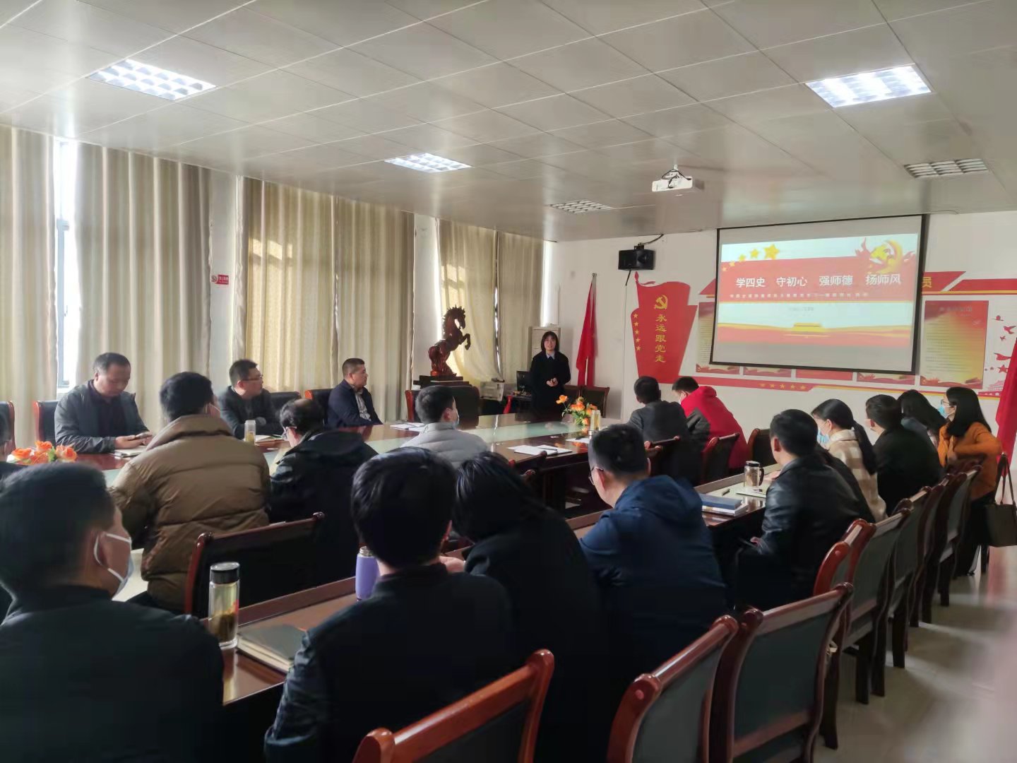 11月9日下午,304永利集团举办“学四史 守初心 强师德 扬师风”主题教育党课,全体教职工党员参加。教工支部书记王平俊为党员们上了一堂题为《学四史强师德师风》的党课。