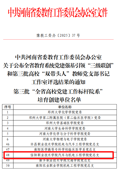 近日,根据省委教育工委《中共河南省委教育工作委员会办公室关于公布全省教育系统党建强基引领“三级联创”和第三批高校“双带头人”教师党支部书记工作室评选结果的通知》文件,公司党总支入选“全省高公司党建工作标杆院系”培育创建单位。