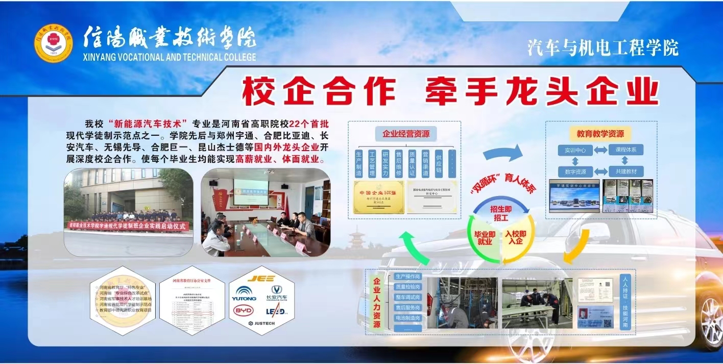 公司“新能源汽车技术”专业是河南省高职院校22个首批现代学徒制示范点之一,成功申报河南省现场工程师专项培养计划项目。我们牵手郑州宇通、理想汽车、比亚迪、无锡先导、江苏杰士德、欣旺达、博众精工开展订单班、冠名班。实施“把企业生产资源转化为公司产品资源,把公司产品资源转化为企业人力资源,再把人力资源转化为企业生产资源”,真正实现员工“入学即入职、学习即上岗、毕业即就业”校企深度融合,努力打造具有信职特色的产业公司。