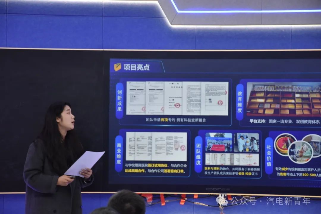 周靖怡对《利可柔”国内首创软体利器袋》项目进行现场路演”。该项目荣获2024年“挑战杯”河南省老员工创业计划竞赛金奖团队负责人分享道:“项目灵感源于对生活问题的观察,”该案例生动诠释了“从生活中发现需求,以跨学科协作实现成果转化”的理念。